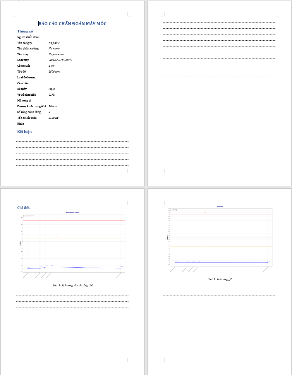 Vibration Viewer hỗ trợ xuất báo cáo phân tích một cách nhanh chóng, giúp người dùng dễ dàng tổng hợp và chia sẻ kết quả đo rung động. Báo cáo được trình bày rõ ràng, bao gồm các biểu đồ như waveform, phổ tần số (FFT) và các thông tin phân tích liên quan.